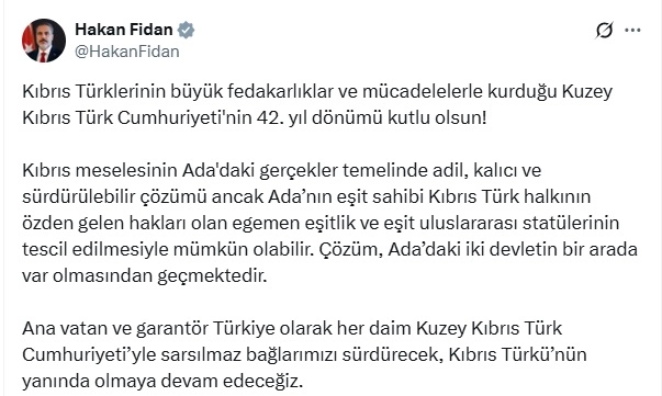 ANKARA, (DHA)- DIŞİŞLERİ Bakanı Hakan Fidan, Kuzey Kıbrıs Türk Cumhuriyeti'nin (KKTC) 42'nci kuruluş yıl dönümü mesajında "Çözüm, Ada’daki iki devletin bir arada var olmasından geçmektedir" dedi.