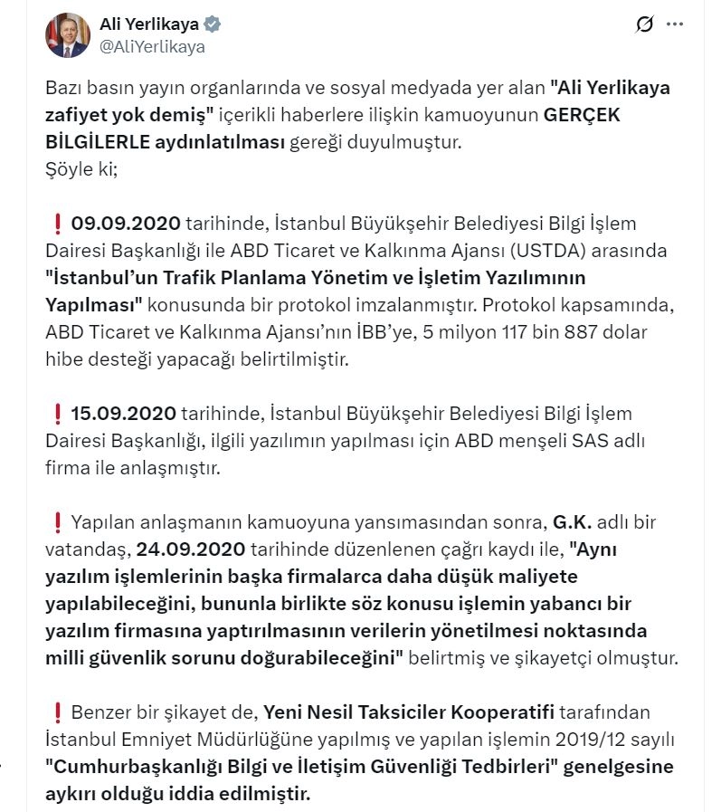 Bakan Yerlikaya, sosyal medya hesabından yaptığı açıklamada, "Bazı basın yayın organlarında ve sosyal medyada yer alan 'Ali Yerlikaya zafiyet yok demiş' içerikli haberlere ilişkin kamuoyunun gerçek bilgilerle aydınlatılması gereği duyulmuştur. Şöyle ki; 9 Eylül 2020 tarihinde, İstanbul Büyükşehir Belediyesi Bilgi İşlem Dairesi Başkanlığı ile ABD Ticaret ve Kalkınma Ajansı (USTDA) arasında 'İstanbul’un Trafik Planlama Yönetim ve İşletim Yazılımının Yapılması' konusunda bir protokol imzalanmıştır. Protokol kapsamında, ABD Ticaret ve Kalkınma Ajansı'nın İBB'ye, 5 milyon 117 bin 887 dolar hibe desteği yapacağı belirtilmiştir. 15 Eylül 2020 tarihinde, İstanbul Büyükşehir Belediyesi Bilgi İşlem Dairesi Başkanlığı, ilgili yazılımın yapılması için ABD menşeli SAS adlı firma ile anlaşmıştır. Yapılan anlaşmanın kamuoyuna yansımasından sonra, G.K. adlı bir vatandaş, 24 Eylül 2020 tarihinde düzenlenen çağrı kaydı ile, 'Aynı yazılım işlemlerinin başka firmalarca daha düşük maliyete yapılabileceğini, bununla birlikte söz konusu işlemin yabancı bir yazılım firmasına yaptırılmasının verilerin yönetilmesi noktasında milli güvenlik sorunu doğurabileceğini' belirtmiş ve şikayetçi olmuştur. Benzer bir şikayet de Yeni Nesil Taksiciler Kooperatifi tarafından İstanbul Emniyet Müdürlüğüne yapılmış ve yapılan işlemin 2019/12 sayılı 'Cumhurbaşkanlığı Bilgi ve İletişim Güvenliği Tedbirleri' genelgesine aykırı olduğu iddia edilmiştir" dedi.