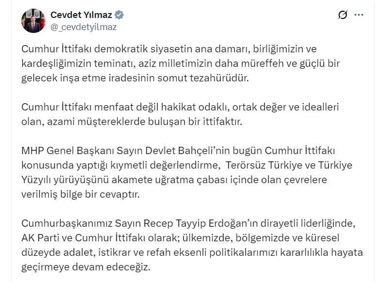 Cumhurbaşkanı Yardımcısı Cevdet Yılmaz, MHP Genel Başkanı Devlet Bahçeli'nin Cumhur İttifakı ile ilgili değerlendirmelerine ilişkin sosyal medya hesabından açıklama yaptı. Yılmaz, açıklamasında, "Cumhur İttifakı, demokratik siyasetin ana damarı, birliğimizin ve kardeşliğimizin teminatı, aziz milletimizin daha müreffeh ve güçlü bir gelecek inşa etme iradesinin somut tezahürüdür. Cumhur İttifakı, menfaat değil hakikat odaklı, ortak değer ve idealleri olan, azami müştereklerde buluşan bir ittifaktır. MHP Genel Başkanı Sayın Devlet Bahçeli’nin bugün Cumhur İttifakı konusunda yaptığı kıymetli değerlendirme, Terörsüz Türkiye ve Türkiye Yüzyılı yürüyüşünü akamete uğratma çabası içinde olan çevrelere verilmiş bilge bir cevaptır. Cumhurbaşkanımız Sayın Recep Tayyip Erdoğan’ın dirayetli liderliğinde, AK Parti ve Cumhur İttifakı olarak; ülkemizde, bölgemizde ve küresel düzeyde adalet, istikrar ve refah eksenli politikalarımızı kararlılıkla hayata geçirmeye devam edeceğiz" ifadelerini kullandı. (DHA)