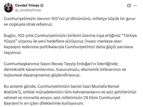 ANKARA, (DHA)- CUMHURBAŞKANI Yardımcısı Cevdet Yılmaz, "Cumhuriyetimizin ilanının 102'nci yıl dönümünü, milletçe büyük bir gurur ve coşkuyla idrak ediyoruz. Bugün, 102 yıllık Cumhuriyetimizin birikimi üzerine inşa ettiğimiz 'Türkiye Yüzyılı' vizyonu ile yeni hedeflere yürüyoruz" dedi.