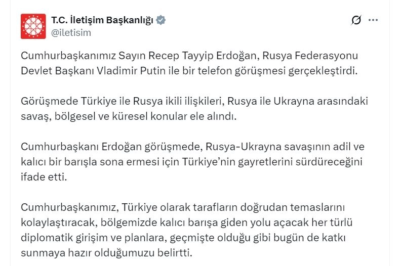İletişim Başkanlığı'nın sosyal medya hesabından yapılan açıklamada, "Cumhurbaşkanımız Sayın Recep Tayyip Erdoğan, Rusya Federasyonu Devlet Başkanı Vladimir Putin ile bir telefon görüşmesi gerçekleştirdi. Görüşmede Türkiye ile Rusya ikili ilişkileri, Rusya ile Ukrayna arasındaki savaş, bölgesel ve küresel konular ele alındı. Cumhurbaşkanı Erdoğan görüşmede, Rusya-Ukrayna savaşının adil ve kalıcı bir barışla sona ermesi için Türkiye'nin gayretlerini sürdüreceğini ifade etti. Cumhurbaşkanımız, Türkiye olarak tarafların doğrudan temaslarını kolaylaştıracak, bölgemizde kalıcı barışa giden yolu açacak her türlü diplomatik girişim ve planlara, geçmişte olduğu gibi bugün de katkı sunmaya hazır olduğumuzu belirtti" denildi. (DHA)