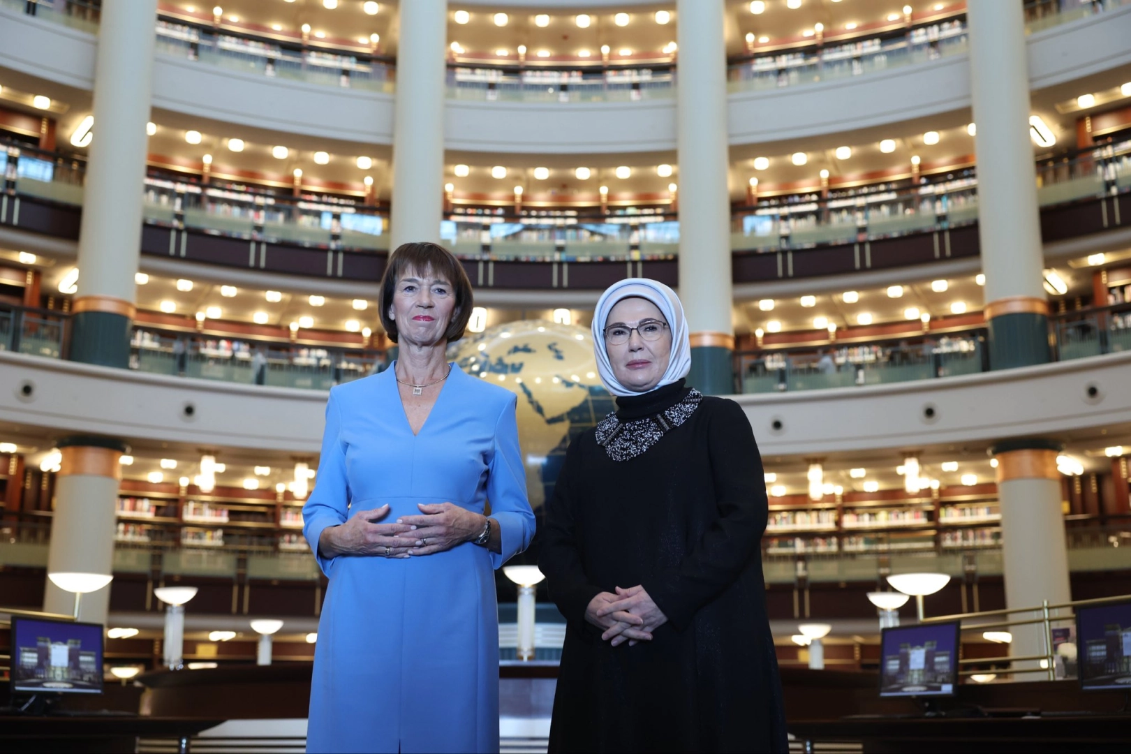 Emine Erdoğan, Charlotte Merz'i kütüphaneye gelişinde kapıda samimi şekilde karşıladı. Kütüphanenin Cihannüma Salonu'na geçen lider eşleri, Almanya Kitaplığı'ndaki eserleri inceledi. Emine Erdoğan, Merz'e Mevlana'nın 'Mesnevi' eserinin Almanca baskısını ve İletişim Başkanlığı'nca hazırlanan 'Türkiye' tanıtım kitabını hediye etti.