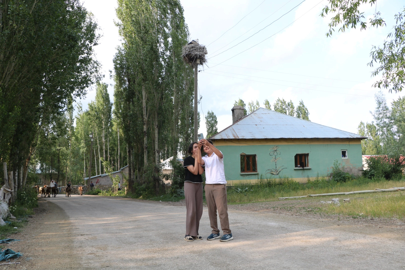 Yaşar KAPLAN/YÜKSEKOVA(Hakkari),(DHA)- HAKKARİ'nin Yüksekova ilçesine bağlı Köprücük köyünde yaklaşık 22 yıl önce gelerek yuva yapan 2 leylek, yavruları da doğunca yaz-kış köyden ayrılmadı. Leylekler, 20 yıl boyunca caminin soba bacasına yuva yaptı. Caminin 2 yıl önce yıkılması sonrasında yuvalarını elektrik direğine taşıyan leyleklere, köylüler bugüne kadar olduğu gibi Kurban Bayramı'nda da yiyecek verip, yuva önünde fotoğraf çekti. Yüksekova'daki Nehil Sazlığı ve çevresindeki sıradağlar nedeniyle zengin bitki örtüsü ve sulak alanlara sahip Yüksekova, her yıl yüzlerce kuş türüne ev sahipliği yaparken, ilçeye 10 kilometre uzaklıktaki Köprücük köyü de leyleklerin uğrak yeri oldu. Yaklaşık 22 yıl önce köye gelip cami bacasına yuva yapan leylek çifti, yaz ve kış aylarında yuvalarından ayrılmayıp, yavrularını burada büyütünce köylüler sahip çıktı. Leyleklerin kaldığı eski cami 2 yıl önce yıkılıp yerine yeni cami yapılınca erkek, dişi ve yavru leylek, bu kez köy içindeki elektrik direğine yuva yaptı. Köydeki yaşamlarını sürdüren leyleklere, yıllardır yiyecek verip sahip çıkan köylüler, Kurban Bayramı'nda da leylekleri unutmadı. Köylüler, yiyecek verdikleri leyleklerin konakladıkları yuva önünde selfie çekti.'KÖYÜMÜZE RENK KATTILAR'Köylülerden Serdar Demir, "22 yıldır köyde bizimle birlikte yaşıyorlar. Onlar bize, biz onlara alıştık. Artık civar köylerde yaşayanlar bile köyümüze gelip leylekleri görmek istiyorlar ve hatıra fotoğrafı çekiyorlar. Leylekler köyümüzü renklendirdi. Köylüler olarak leyleklerimizi çok seviyoruz. Biz buranın havasına nasıl alışmışsak onlar da alıştı" dedi. Köylülerden Bahattin Demir ise "Köyümüze renk kattılar. Hiç tanımadığımız, bilmediğimiz insanlar gelip leyleklere bakıyorlar. Daha önce caminin bacasındaydı. Cami yıkıldıktan sonra da köyden göç edeceğini düşündük. Ancak köyü seven bu leylekler bu kez de yuvalarını elektrik direğine taşıdılar. Eskinden sadece bir tane vardı sonra aile oldular" diye konuştu. (DHA)