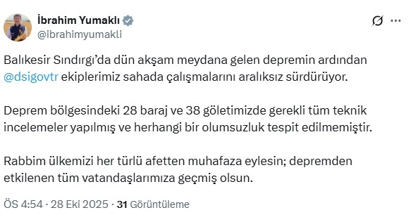Bakan Yumaklı, sosyal medya hesabından yaptığı açıklamada, "Balıkesir Sındırgı’da dün akşam meydana gelen depremin ardından Devlet Su İşleri (DSİ) Genel Müdürlüğü’ne bağlı ekiplerimiz sahada çalışmalarını aralıksız sürdürüyor. Deprem bölgesindeki 28 baraj ve 38 göletimizde gerekli tüm teknik incelemeler yapılmış ve herhangi bir olumsuzluk tespit edilmemiştir. Rabb'im ülkemizi her türlü afetten muhafaza eylesin; depremden etkilenen tüm vatandaşlarımıza geçmiş olsun” ifadelerini kullandı. (DHA)