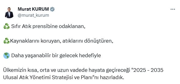 Çevre, Şehircilik ve İklim Değişikliği Bakanı Murat Kurum'un onayıyla Çevre Yönetimi Genel Müdürlüğü tarafından Ulusal Atık Yönetimi Stratejisi ve Planı (2025-2035) hazırlandı. Plana ilişkin sosyal medya hesabından paylaşım yapan Bakan Murat Kurum, "Sıfır Atık prensibine odaklanan, kaynaklarını koruyan, atıklarını dönüştüren, daha yaşanabilir bir gelecek hedefiyle ülkemizin kısa, orta ve uzun vadede hayata geçireceği '2025-2035 Ulusal Atık Yönetimi Stratejisi ve Planı'nı hazırladık" ifadelerini kullandı.