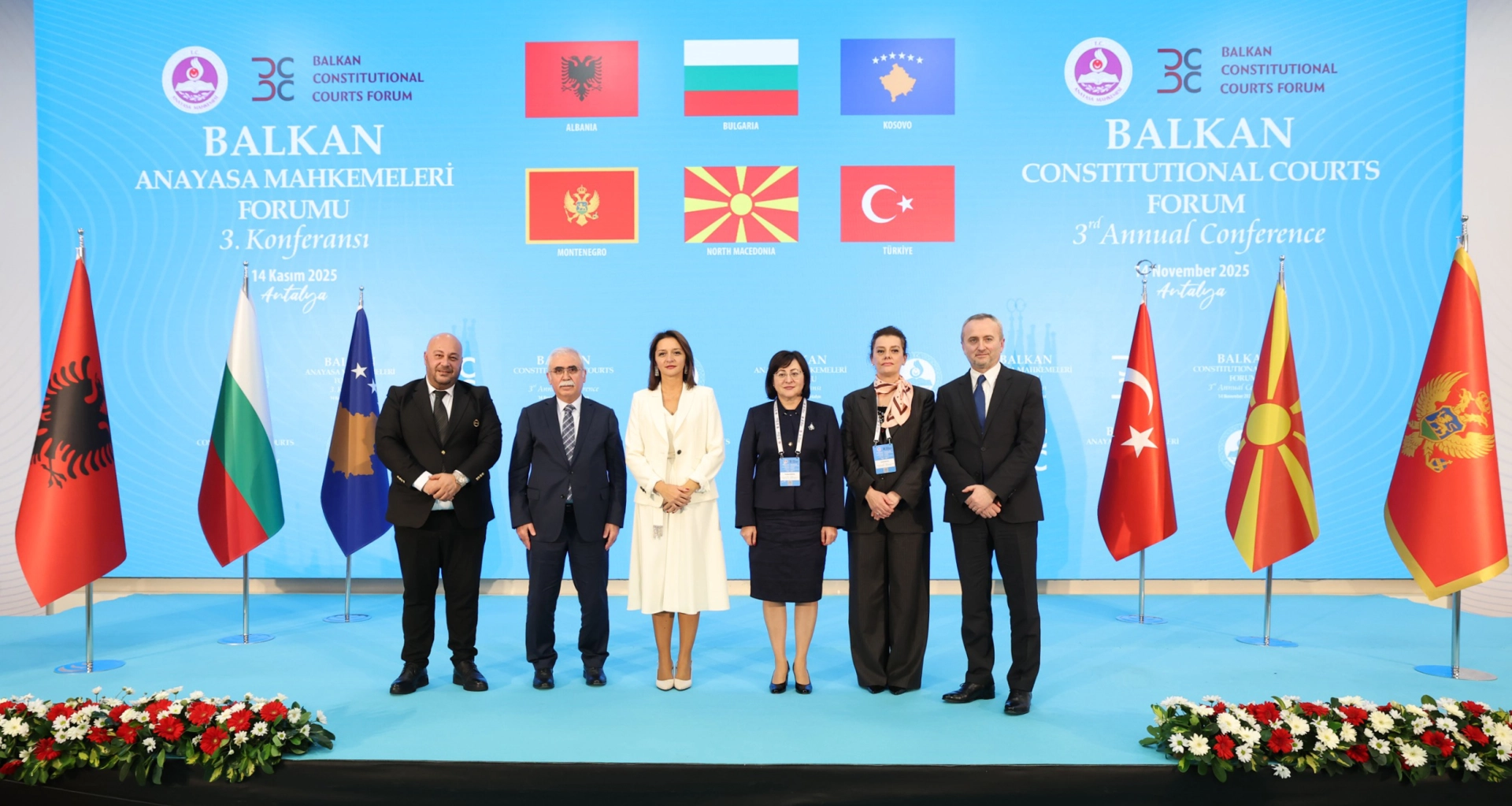 Türkiye Cumhuriyeti Anayasa Mahkemesi ev sahipliğinde düzenlenen 'İnsan Haklarının Standardizasyonu ve Anayasa Yargısının Rolü' konulu Balkan Anayasa Mahkemeleri Forumu 3. Konferansı sürüyor. Adalet Teşkilatını Güçlendirme Vakfı (ATGV) Antalya Eğitim ve Sosyal Tesisi'nde düzenlenen konferansa forum üyeleri Arnavutluk, Bulgaristan, Karadağ, Kosova, Kuzey Makedonya ile forumun gözlemci statüsündeki üyeleri Bosna-Hersek, Hırvatistan ve Romanya anayasa mahkemelerinin yanı sıra Azerbaycan, Kuzey Kıbrıs Türk Cumhuriyeti, Moldova anayasa/yüksek mahkeme başkan ve üyeleri ile Afrika Anayasa Yargısı Konferansı Daimi Genel Sekreteri ve Avrupa İnsan Hakları Mahkemesi yargıçları katıldı.