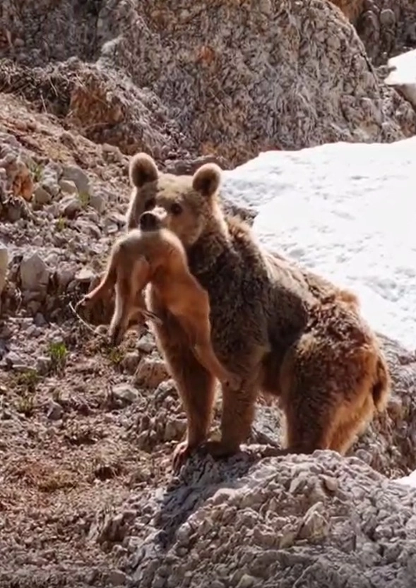 Esra TÜRKER/BURSA, (DHA)- MUNZUR Dağları’nda bir bozayının dağ keçisi yavrusunu avladığı anlar, Bursalı fotoğraf sanatçısı Samet Asutay tarafından dronla görüntülendi. Anne dağ keçisinin, avlanan yavrusunu aradığı anlar da görüntülere yansıdı.Bursalı yaban hayatı fotoğrafçısı Samet Asutay, geçen hafta 2 arkadaşıyla birlikte Munzur Dağları’nda doğa gezisine çıktı. Asutay, bir bozayının yavrusuyla birlikte yamaçtan inen bir dağ keçisini kovaladığını gördü. Bozayı, annesinin arkasında kalan yavru dağ keçisini yakalayıp, bölgeden uzaklaştı. Anne dağ keçisi, karla kaplı yamaçta bir süre yavrusunu ararken, yaşananlar Asutay tarafından dronla görüntülendi. Samet Asutay, görüntüleri sosyal medya hesabından, ‘Doğanın Gerçek Yüzü: Munzur Dağları’nda Nefes Kesen Anlar’ başlığıyla paylaşarak şu ifadelere yer verdi:“Geçen hafta Munzur Dağları’na üç arkadaş yaptığımız gezi sırasında unutulmaz bir doğa olayına tanıklık ettik. Öğle saatlerinde dağ keçisi (şamua) yavrusuyla birlikte yamaçtan aşağı iniyordu. Tam o anda, uzaktan yaklaşan bir bozayıyı fark ettik. Telefonla kayda almaya başladık, ama bu anı daha net kayda almak için hemen dron ile havalandık. Ayı ve keçiye rahatsızlık vermemek adına uzak mesafeden, dronumuzun tele lensiyle 3x zoom yaparak çekim yaptık. Bu inanılmaz karşılaşma, doğanın acımasız ama hayranlık uyandıran dengesini bir kez daha gözler önüne serdi. Anne şamua ise sağa sola giderek yavrusunu aramaya devam etti.” (DHA)