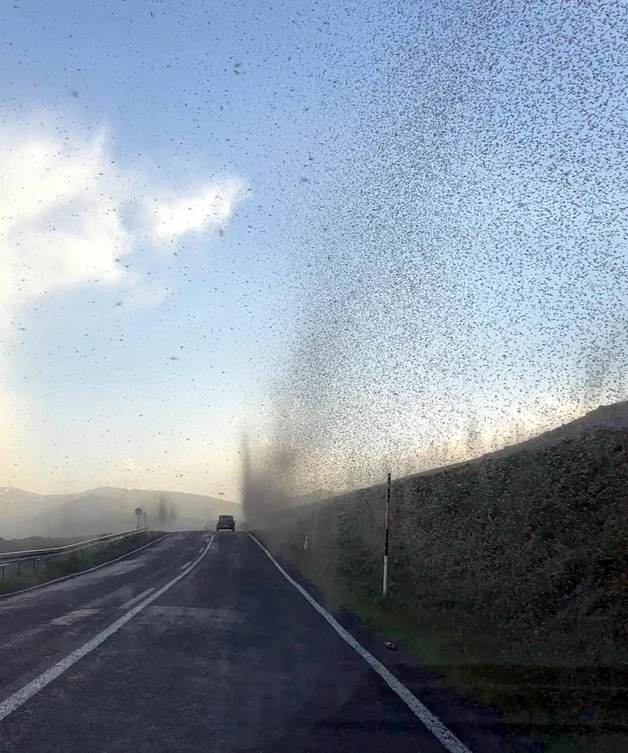 Deniz BAŞLI-Dinçer AKTEMUR/ARDAHAN, (DHA)- ARDAHAN'ın Çıldır ilçesindeki Çıldır Gölü'nde üreyen yeşil sineklerin toplu halde uçuşları kar fırtınasını anımsattı. O anlar, cep telefonuyla görüntülendi.Türkiye’nin Gürcistan ve Ermenistan’a komşu illeri Ardahan ve Kars arasında bulunan, 124 kilometrekare alanı ile Doğu Anadolu Bölgesi'nin Van’dan sonra en büyük ikinci gölü olan Çıldır Gölü’nün dört bir tarafı, yöre halkı tarafından zararsız oldukları belirtilen sineklerle kaplandı. Her yıl mayıs ayında ortaya çıkan ve bölge halkının 'yeşil sinek' olarak nitelendirdiği sineklerin bu yıl fazla olması ve göl çevresinin tamamını kaplaması dikkat çekti. Çıldır Gölü'nü gezmek için bölgeye giden Fatih Balcı, bazı noktalarda hortumu andıran görüntü oluşturan sinek fırtınasını cep telefonuyla saniye saniye kaydetti. (DHA)