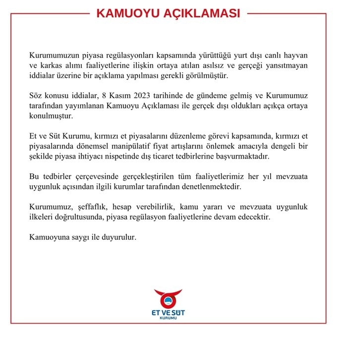 ESK'nin sosyal medya hesabından yapılan açıklamada, "Kurumumuzun piyasa regülasyonları kapsamında yürüttüğü yurt dışı canlı hayvan ve karkas alımı faaliyetlerine ilişkin ortaya atılan asılsız ve gerçeği yansıtmayan iddialar üzerine bir açıklama yapılması gerekli görülmüştür. Söz konusu iddialar, 8 Kasım 2023 tarihinde de gündeme gelmiş ve Kurumumuz tarafından yayımlanan kamuoyu açıklaması ile gerçek dışı oldukları açıkça ortaya konulmuştur. Et ve Süt Kurumu, kırmızı et piyasalarını düzenleme görevi kapsamında, kırmızı et piyasalarında dönemsel manipülatif fiyat artışlarını önlemek amacıyla dengeli bir şekilde piyasa ihtiyacı nispetinde dış ticaret tedbirlerine başvurmaktadır. Bu tedbirler çerçevesinde gerçekleştirilen tüm faaliyetlerimiz her yıl mevzuata uygunluk açısından ilgili kurumlar tarafından denetlenmektedir. Kurumumuz, şeffaflık, hesap verebilirlik, kamu yararı ve mevzuata uygunluk ilkeleri doğrultusunda, piyasa regülasyon faaliyetlerine devam edecektir" denildi.