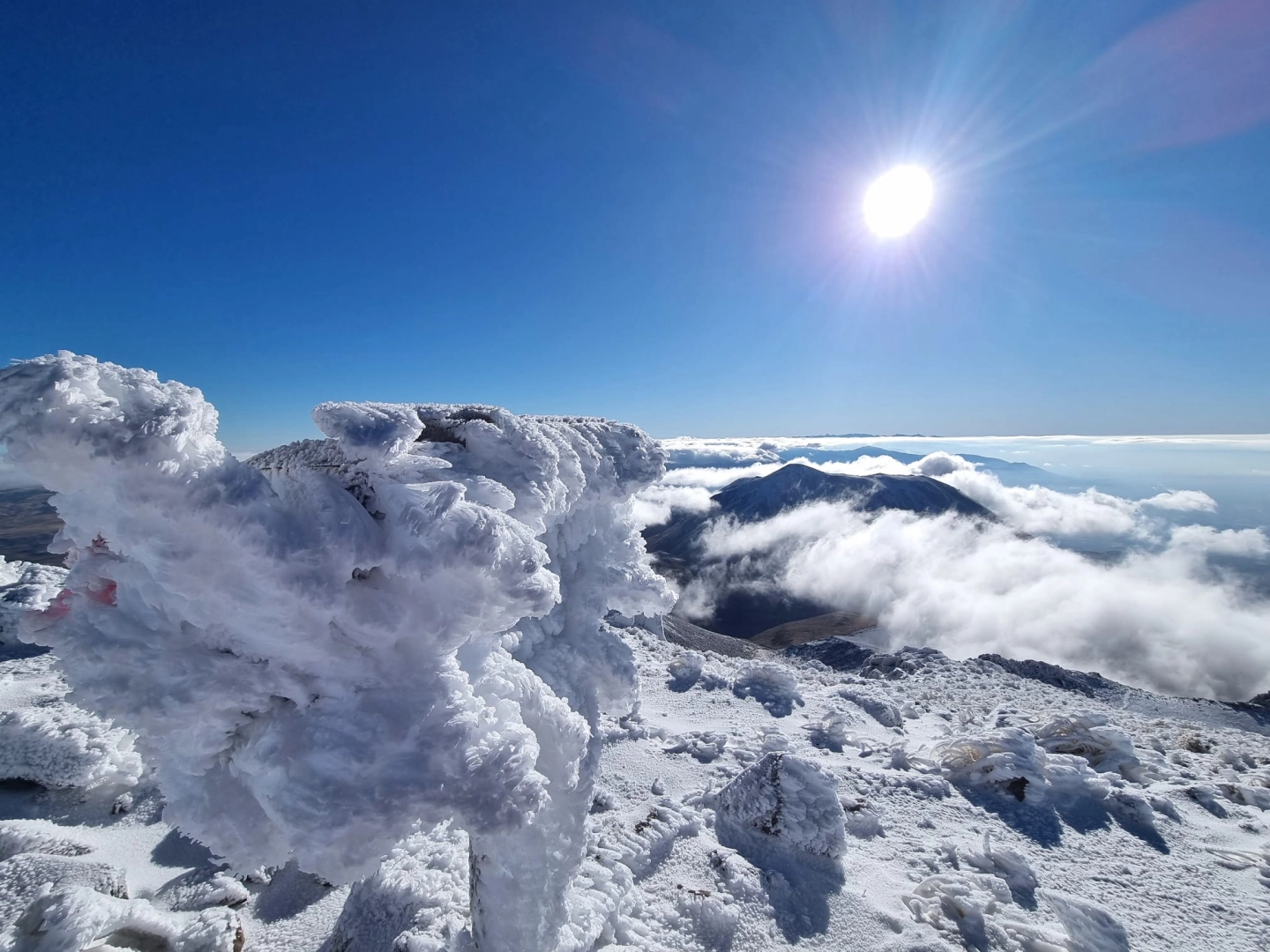 Erkan ALTUNTAŞ/ AKSARAY, (DHA)- AKSARAY’da havaların soğumasıyla 3 bin 268 rakımlı Hasan Dağı'nın zirvesine ilk kar düştü. Zirve karla kaplanırken, alt bölgelerde ise hava sıcaklığı hissedilir derecede düştü. Dağcı Ahmet Acun ile fotoğraf sanatçısı Ömer Yiğit, 5,5 saatlik zorlu yolculuğun ardından kar yığışı ile oluşan kartpostallık manzarayı görüntüledi.Aksaray'daki 3 bin 268 rakımlı Hasan Dağı'na bölgenin ilk karı yağdı. Dağın zirvesi karla kaplanırken, kent merkezinde de hava sıcaklığı hissedilir şekilde düştü. Dağcı Ahmet Acun ile fotoğraf sanatçısı Ömer Yiğit, 5,5 saatlik tırmanışın ardından zirvedeki beyaz güzelliği görüntüledi. Zirvede güzel görüntülere tanıklık ettiklerini belirten Ömer Yiğit, "Zirvede yılın ilk karını görüntüledik. Yaklaşık 10 santim kar var. Güneş, bulutlarla ve muhteşem sisle birleşince tüm yorgunluğumuzu aldı. Fotoğrafları sosyal medyadan paylaşınca Türkiye’nin dört bir tarafından dağcılardan ve fotoğraf tutkunları bu manzarayı beğenip, bu muhteşem olayı görmek için Aksaray’a geleceklerini söylediler” diye konuştu.