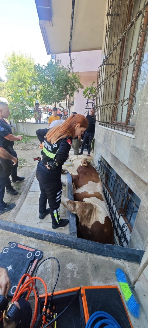 İSTANBUL, (DHA)- BAHÇELİEVLER'de binanın bahçesine bağlanan kurbanlık boğa, kesim için ipi çözülünce bodrum kattaki dairenin pencere boşluğuna düştü. Çevredekiler, ekiplerin kurtarma çalışmasını cep telefonu kamerasıyla kaydetti. Olay, bugün öğle saatlerinde Kocasinan Mahallesi'nde meydana geldi. Edinilen bilgiye göre; kurban pazarından satın alınan boğa, bir binanın bahçesine bağlandı. Kesim için bağı çözülen boğa kaçmaya çalışırken binanın bodrum katındaki dairenin pencere boşluğuna düştü. Boğayı bulunduğu yerden çıkaramayan sahipleri durumu itfaiye ve belediye ekiplerine haber verdi. İhbar üzerine olay yerine gelen ekipler, iş makinesine bağladıkları boğayı bulunduğu yerden kurtardı. Çevredekiler kurtarma operasyonunu cep telefonu kamerasıyla kaydetti. (DHA)