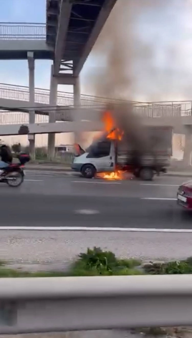 Baran AKKAYA-Derya KORKMAZ/İSTANBUL,(DHA)-BÜYÜKÇEKMECE, D-100 karayolunda kamyonette çıkan yangın söndürüldü. Alevlerin sardığı araç metal yığınına dönerken yangını çevredeki sürücüler cep telefonu kamerasıyla kaydetti.