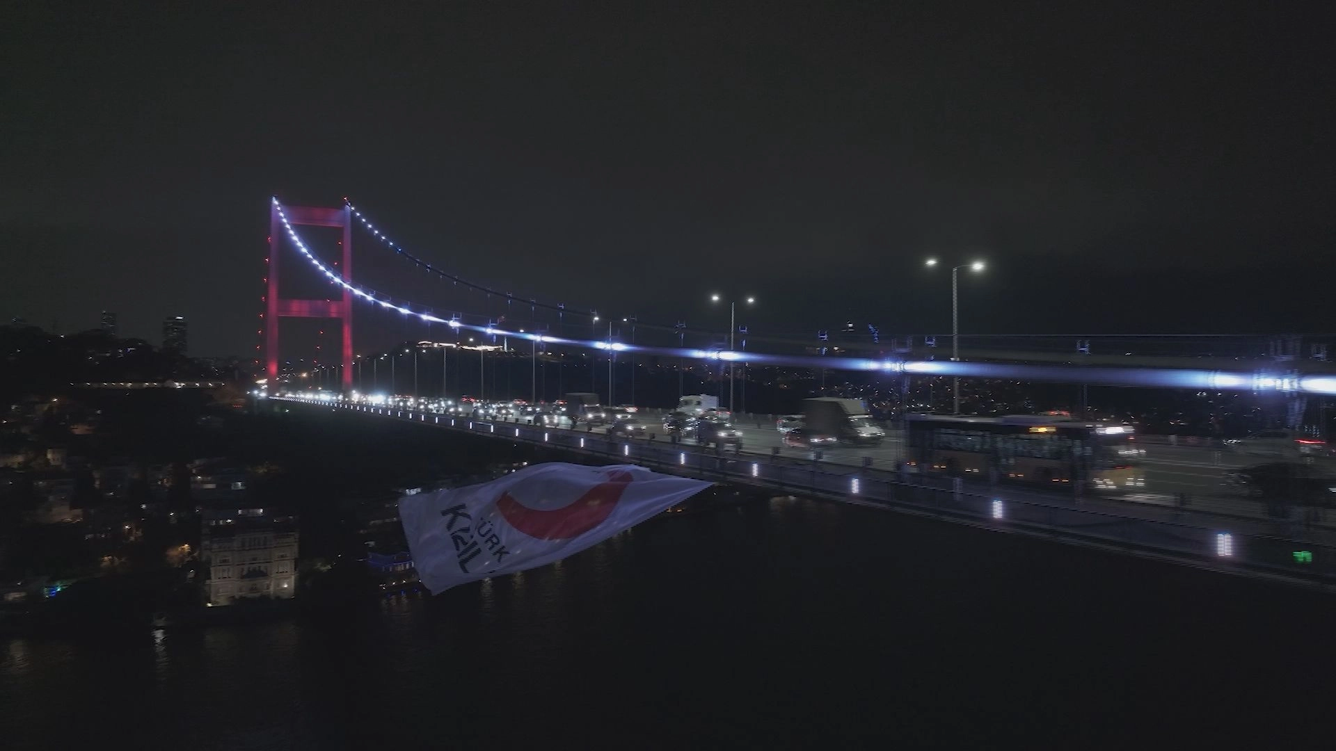 'İyiliğe devam' temasıyla 29 Ekim-4 Kasım tarihleri arasında kutlanan kutlanan 'Kızılay Haftası' sebebiyle Fatih Sultan Mehmet Köprüsü'nde Kızılay bayrağı dalgalandırıldı. Köprüye asılan bayrak dronla havadan görüntülendi. (DHA)