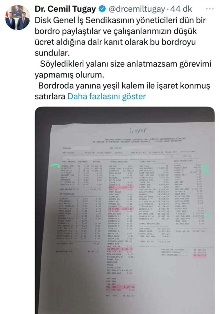 CEMİL TUGAY İLE İŞÇİLER ARASINDA BORDRO TARTIŞMASIGenel-İş Sendikası'nın maaş bordrolarını paylaşması üzerine yaşanan tartışma büyürken, İzmir Büyükşehir Belediye Başkanı Cemil Tugay da sosyal medya hesabından paylaşım yaptı. Tugay, paylaşımında, "DİSK Genel-İş Sendikası'nın yöneticileri dün bir bordro paylaştılar ve çalışanlarımızın düşük ücret aldığına dair kanıt olarak bu bordroyu sundular. Söyledikleri yalanı size anlatmazsam görevimi yapmamış olurum. Bordroda yanına yeşil kalem ile işaret konmuş satırlara dikkatinizi çekmek istiyorum, bunlar değişik nedenlerle yapılan eksik ödemeler" dedi.'20 GÜN ÇALIŞMIŞ VE ÜCRET DÜŞMÜŞ'Tugay, paylaşımının devamında, "Bu çalışanımız; normalde 26 gün çalışması gerekirken 20 gün çalışmış ve buradan ücret düşmüş. Ücretsiz izin kullanmış ve 965,81 buradan gitmiş. Avans kullanmış ve buradan 16,947 lira kesilmiş. Erzak yardımı kesintisi olmuş, buradan da 2 bin 947 TL 42 kuruş kesinti yapılmış. Bunları siz toplayın ve normal maaş diye duyurdukları rakama siz ilave edin, doğrunun ne olduğunu siz görün. Yıllardır herkese yalan söyleyenlere sözüm; yeter artık. Gerçekten yeter" ifadelerine yer verdi. (DHA)Yağmur ÖNGÜN/İZMİR, (DHA)