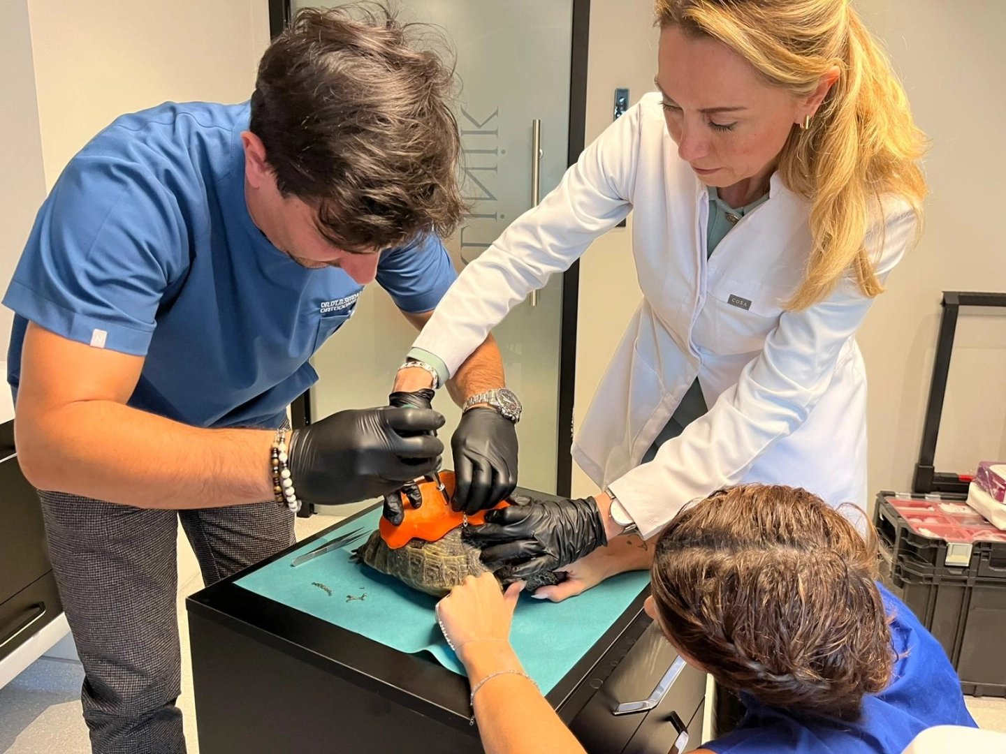Diş Hekimi Serdar Akdeniz ise, "Kaplumbağanın kabuğunda büyük kırıklar vardı. Geleneksel akrilikle yapılan yapışkanlarla yaptığımız zaman çok başarılı olmayacağını düşündük. Üç boyutlu teknolojileri insanlar için kullanıyoruz; niye kaplumbağa için kullanmayalım dedik. Ve kaplumbağanın ilk önce kabuğunu taradık. Sonrasında da bir tasarım yaptık. Üzerine bu şekilde bir protez kabuk yerleştirdik" dedi. (DHA)