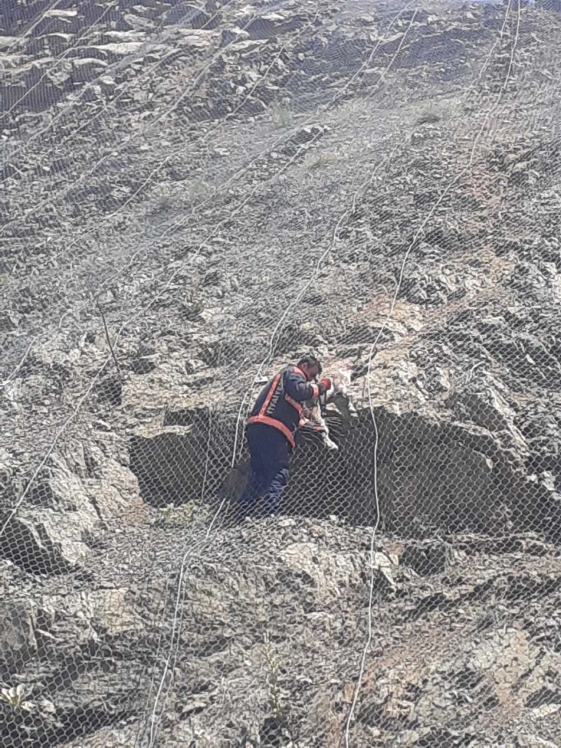 MALATYA, (DHA)- MALATYA'nın Pütürge ilçesinde dağlık alanda koruma ağına takılan 2 yabani keçiyi itfaiyeciler kurtardı.Pütürge ilçesi Poskıran Mahallesi'nde dağlık alanda dolaşan 2 yabani keçi, dağda kaya parçalarının düşmesini önlemek amacıyla serilen koruma ağına takıldı. Çevredekiler, durumu 112 Acil Çağrı Merkezi'ne bildirdi. Bölgeye sevk edilen itfaiye ekipleri, uzun uğraşlarla koruma ağlarına takılan 2 yabani keçiyi zarar vermeden kurtardı. Kurtarılan keçiler yeniden doğaya salıverildi. (DHA)