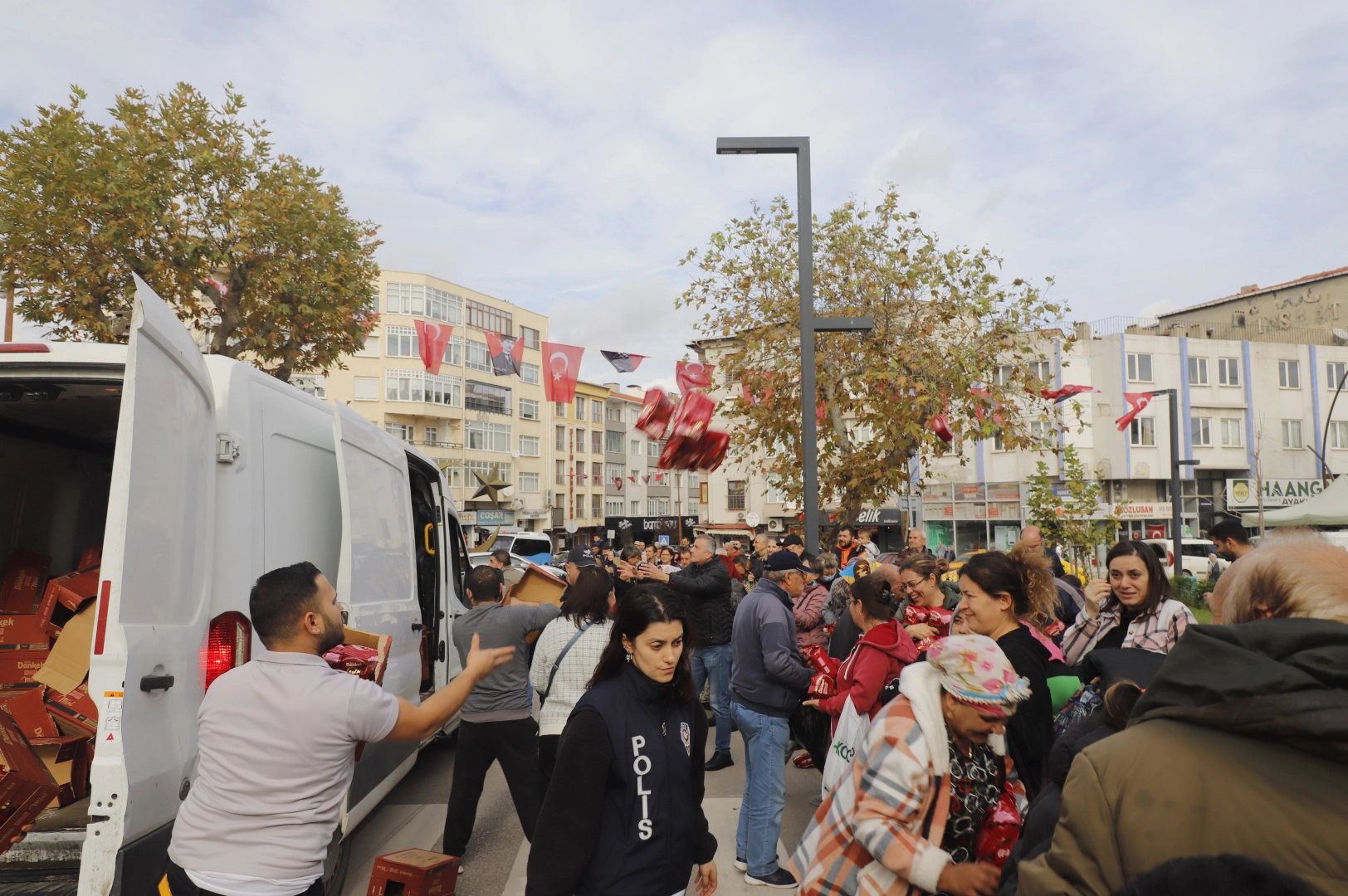 Bir market tarafından kek dağıtımı yapıldı, bu sırada izdiham yaşandı. Vatandaşlar, dağıtılan keklerden almak için birbiriyle yarıştı. Bazı çocuklar, ezilme tehlikesi geçirdi. İzdiham oluşunca keklerin dağıtıldığı araç, zabıta ve polis ekipleri tarafından tören alanından uzaklaştırıldı. (DHA)