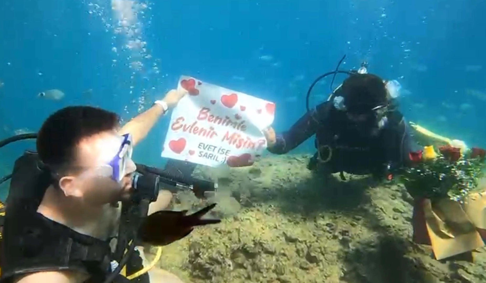 Kentte restoran müdürü olarak görev yapan Muhammet Akbıyık, uzun süre birlikte olduğu Ezgi Uysal'a sürpriz evlilik teklifi planladı. Çift, Okurcalar Mahallesi'ndeki dalış okulunun eğitmenleri eşliğinde denize tüplü dalış yaptı. Bu sırada Akbıyık, önceden hazırladığı 'Benimle evlenir misin' yazısının yer aldığı kağıdı açıp Uysal'a evlilik tekli yaptı. Teklifinin kabul edilmesinin ardından Akbıyık, Uysal'a yüzük taktı. Çiftin mutlu anları su altı kamerasıyla kaydedildi. (DHA)