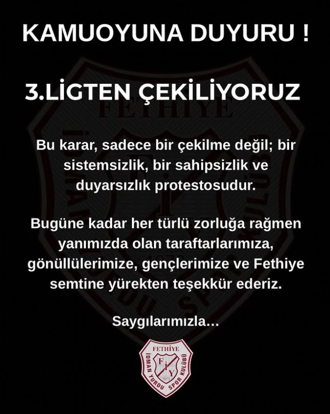 Mehmet İNAN/BURSA, (DHA)-BÖLGESEL Amatör Ligi’nde şampiyon olarak TFF 3’üncü Lig’e çıkan Bursa temsilcisi Fethiye İdman Yurdu Spor Kulübü, maddi imkansızlıklar ve destek verilmemesi gerekçe gösterilerek, ligden çekildiğini açıkladı.2024-2025 sezonunda Bölgesel Amatör Lig 8’inci Grup’ta şampiyon olarak TFF 3’üncü Lig’e yükselen Bursa temsilcisi Fethiye İdman Yurdu Spor Kulübü, sosyal medya hesabından ligden çekilme kararı aldığını duyurdu. Kararın, sistemsizlik, sahipsizlik ve duyarsızlık protestosu olduğu belirtilen açıklamada, “1973 yılında Bursa’nın Fethiye Mahallesi’nde kurulan Fethiye İdman Yurdu Spor Kulübü, bir semtin inancını, gençliğini ve tutkusunu sahaya yansıtarak son üç yılda Türk futbol tarihine eşine az rastlanır bir başarı hikayesi yazmıştır. 2021-2022 sezonunda Amatör Lig’de şampiyon olarak Süper Amatör Lig’e yükselen takımımız, 2023-2024 sezonunda Süper Amatör’de gösterdiği kararlılıkla bir kez daha şampiyon olmuş ve Bölgesel Amatör Lig’e adım atmıştır. Bu yükselişin tesadüf değil, inanç ve emek ürünü olduğunu 2024-2025 sezonunda BAL Ligi şampiyonu olarak 3. Lig’e çıkarak kanıtlamış bulunmaktayız. Üst üste alınan şampiyonluklar, mahalle ruhunun, özverinin ve saf futbol aşkının neleri başarabileceğini göstermiştir. Ancak ne yazık ki sportif başarı tek başına yeterli olmamaktadır. Ülkemizde profesyonel liglerde mücadele edebilmek, sadece futbolcu teriyle değil; güçlü bir altyapı, sağlam bir ulaşım ağı, sürdürülebilir maddi kaynaklar ve en önemlisi yerel yönetimlerin desteğiyle mümkündür. Bizler, bu zorlu yolda daha ileriye gidebilmek için elimizden geleni yaptık. Defalarca kez Bursa Büyükşehir Belediyesi’ne, Nilüfer Belediyesi’ne ve ilgili bakanlıklarımıza ulaşarak tesis, kulübümüze tahsis edilmiş bir otobüs ve genel destek taleplerimizi ilettik. Her görüşmemizde yaptıklarımızı, hedeflerimizi, kimseden lüks değil, sadece eşitlik ve adalet beklediğimizi dile getirdik.Fakat maalesef bu çağrılarımız cevapsız kaldı. Ne gençlerimizin gelişimine katkı sağlayacak bir altyapı desteği, ne oyuncularımızı deplasmana götürecek bir otobüs, ne de en temel ihtiyaçlarımızı karşılayacak bir maddi katkı sağlandı. Biz bu şehri ve bu semti onurlandırmak için sahaya çıktık. Ama ne yazık ki arkamızda durması gereken eller bize dönmedi. Bu sebeple, derin bir üzüntüyle bildiriyoruz ki; Fethiye İdman Yurdu Spor Kulübü, 3’üncü Lig’den çekilme kararı almıştır. Bu karar, sadece bir çekilme değil; bir sistemsizlik, bir sahipsizlik ve duyarsızlık protestosudur. Bugün kaybeden biz değiliz. Kaybeden, gençliğine ve değerlerine sırt çeviren Bursa futbolu olmuştur” ifadelerine yer verildi. (DHA)