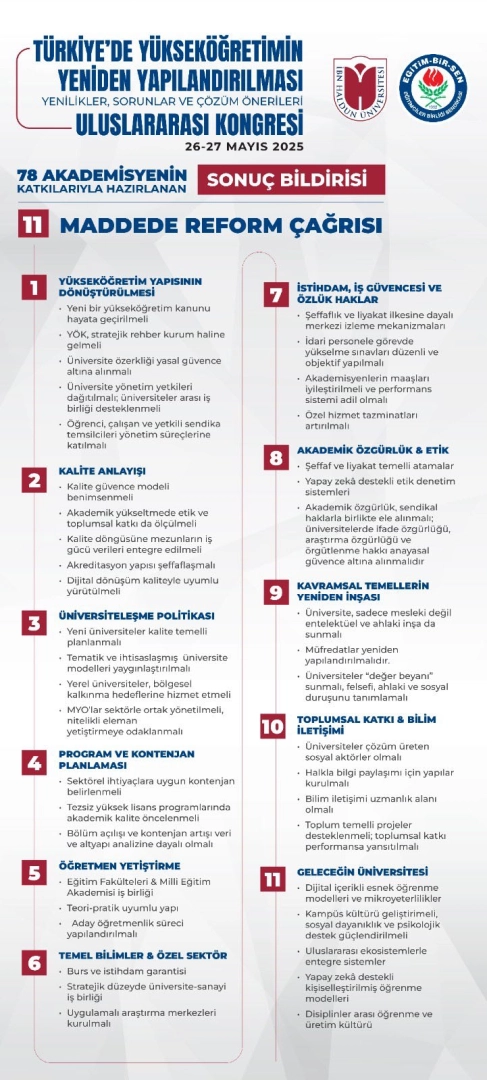 ANKARA, (DHA)- EĞİTİM-Bir-Sen ve İbn Haldun Üniversitesi iş birliğiyle Ankara’da düzenlenen ‘Türkiye’de Yükseköğretimin Yeniden Yapılandırılması: Yenilikler, Sorunlar ve Çözüm Önerileri Uluslararası Kongresi’nin ardından 78 akademisyenin katkısıyla hazırlanan 11 maddelik reform çağrısının yer aldığı sonuç bildirisi yayımlandı. Bildiride, ‘Yükseköğretim kurumlarının yönetiminde yetkilerin tek bir merkezde temerküz etmesini önleyen ve yükseköğretim çalışanlarının her türlü karar mekanizmasında yer almalarını sağlayan nitelikte yeni bir yükseköğretim kanunu hayata geçirilmeli’ çağrısı yapıldı.Bildiride şu ifadelere yer verildi; “YÖK'ün yapısı aşırı merkeziyetçilikten, stratejik rehberlik yapan evrensel bir kuruma doğru dönüştürülmelidir. Yükseköğretim kurumlarının yönetiminde yetkilerin tek bir merkezde temerküz etmesini önleyen ve her türden yetkinin keyfi kullanımını önleyecek mekanizmaları tesis eden, akademik yükseltme sistemini evrensel kabul gören objektif, nesnel ve ölçülebilir kriterlere bağlayan, araştırmacı ve öğretim üyesi yetiştirme sisteminin ana hatlarını yükseköğretim politikaları doğrultusunda düzenleyen, yükseköğretim çalışanlarının her türlü karar mekanizmasında yer almalarını sağlayan nitelikte yeni bir yükseköğretim kanunu hayata geçirilmelidir. Yükseköğretim kurumlarının akademik, bilimsel özerkliğini yükseköğretim kurumlarının akademik personelinin iş güvencesi, yükseköğretime giriş, planlama, koordinasyon ve denetleme mekanizmalarının merkezileştirilmesi gibi istisnaların kabulü̈ ekseninde tanıyan ve koruyan yükseköğretim yasası hayata geçirilmelidir. "Üniversite yönetim yetkileri senato, fakülte kurulları ve iç denetim birimlerine dağıtılmalıdır. Üniversite özerkliği yasal güvence altına alınmalı, siyasi veya bürokratik müdahalelere karşı korunmalıdır. Üniversiteler arası iş birliğini destekleyecek bölgesel koordinasyon yapıları kurulmalıdır. Öğrenciler, çalışanlar (akademik-idari) ve yetkili sendika temsilcisi senato ve üniversite yönetim kurulu çalışmalarına yerine ve konuya göre, karara ortak olarak ya da gözlemci olarak katılabilmelidir. Üniversitelerde gerçekleştirilecek çalıştay, kongre ve reform odaklı kurullarda yetkili sendikalar danışma kurulu üyesi olarak yer almalı, akademik sendikacılık resmi istişare mekanizmalarında temsil edilmelidir."Öğrenciler, akademisyenler, idari personel ve sendika temsilcilerinden oluşan üniversite içi diyaloğu güçlendirecek ‘Katılımcı Konseyler’ kurulmalıdır. İç denetim, öğrenci geri bildirimi ve danışmanlık sistemine dayalı kalite güvence modeli benimsenmelidir. Akademik yükseltmelerde sadece yayın sayısı değil, etik, toplumsal katkı, patent sayısı, ürünleri lisanslama ve öğrenci rehberliği de ölçüt olmalıdır. Mezun izleme sistemleri daha etkin çalışmalı ve kalite döngüsüne istihdam ve iş gücü verileri entegre edilmelidir."Ulusal akreditasyon kurumlarının yapısı şeffaflaşmalı ve akreditasyon ücretleri makul ölçülere çekilmelidir. Dijital dönüşüm ve kalite güvence süreçleri eşgüdüm içinde yeniden yapılandırılmalıdır. Üniversite açılımları sayısal değil kalite odaklı planlamaya dayanmalıdır. Yerel üniversiteler, bölgesel kalkınma hedeflerine hizmet edecek biçimde yapılandırılmalıdır."Tematik ve ihtisaslaşmış üniversite modeli yaygınlaştırılmalıdır. Meslek yüksekokulları, sektörle entegre halinde, illerin etkili alan yöneticileri ile ortak yönetim kurulları oluşturulmalı, mesleki beceriyi geliştirmeye yönelik nitelikli eleman yetiştirmeye odaklanmalıdır. Bölüm tekrarları azaltılmalı, kontenjan planlaması sektörel ve demografik ihtiyaçlara göre belirlenmelidir. Tezsiz yüksek lisans programlarına, akademik kaliteyi önceleyen bir anlayış benimsenmelidir. Üniversiteler arası program geçişleri ve ortak diploma programları artırılmalıdır. Öğrenci sayısı değil, öğrenci-öğretim üyesi oranı ve ders yükü temel alınarak kontenjan belirlenmelidir. Bölüm açılışı ve kontenjan artışı için akademik donanım, yetenek ve beceri beklentileri ile altyapı ve istihdam verisi analiz edilmelidir. Eğitim fakülteleri ile Milli Eğitim Akademisi arasında sağlıklı ve sürdürülebilir bir çalışma yöntemi kurulmalıdır."Teori-pratik uyumu sağlanmalı, uygulama süresi artırılmalıdır. Aday öğretmenlik süreci yapılandırılmalı ve hizmet öncesi eğitim, muhtemel öğretmen ihtiyacına göre stratejik olarak planlanmalıdır. Temel bilimlere yönelen öğrencilere burs ve istihdam garantisi verilmelidir."Üniversite-sanayi iş birlikleri stratejik düzeye taşınmalı, bölümler buna göre yeniden kurgulanmalıdır. Ar-Ge projelerinde özel sektör ve üniversite ortaklığı önceliklendirilmelidir."Uygulamalı araştırma merkezleri kurulmalı, sanayinin ihtiyaç duyduğu alanlara odaklanılmalıdır. Temel bilimlerde kamu destekli özel araştırma fonları oluşturulmalıdır. Araştırma görevlisi, öğretim görevlisi ve öğretim üyesi alımlarında şeffaflık ve liyakat ilkesine dayalı olarak merkezi izleme mekanizmaları kurulmalıdır. Üniversite bünyesindeki idari personel için kariyer planlaması netleştirilmeli, görevde yükselme ve unvan değişikliği sınavları düzenli ve objektif kriterlerle yapılmalıdır. İdari personelin yetki, sorumluluk ve liyakat esasına dayalı statü sistemine kavuşturulması sağlanmalı; bu süreçlerde yetkili sendikaların görüş ve talepleri esas alınmalıdır. Akademisyenlerin maaşları ve özlük hakları iyileştirilmeli ve performans sistemleri adil hale getirilmelidir. Yükseköğretim alanında çalışan kamu görevlilerine yönelik özel hizmet tazminatları 