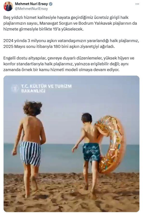 ANKARA, (DHA)- KÜLTÜR ve Turizm Bakanlığı'nca yürütülen Halk Plajları Projesi kapsamında, Manavgat Sorgun ve Bodrum Yalıkavak halk plajlarının hizmete girmesiyle birlikte, ücretsiz girişli halk plajı sayısı 19'a yükselecek.Kültür ve Turizm Bakanlığı tarafından, 'Beş yıldızlı hizmet' anlayışıyla hayata geçirilen Halk Plajları Projesi, vatandaşlardan yoğun ilgi gördü. 1 Ocak-26 Mayıs 2025 tarihleri arasında halk plajlarını, toplam 180 bin 200 kişi ziyaret etti. Türkiye'nin farklı bölgelerinde hizmet veren bu plajlar, denize erişimi kolaylaştıran, temiz, güvenli ve konforlu alanlar sunuyor. Türkiye'nin kıyılarında hizmete alınan halk plajları; çevre dostu altyapıları, engelli erişimine uygun düzenlemeleri, aile dostu sosyal alanları ve yüksek hijyen standartlarıyla sadece yerli vatandaşların değil, Türkiye'ye gelen yabancı turistlerin de takdirini topluyor. Bugüne kadar hizmete sunulan halk plajları; Beldibi Bahçecik, Belek, Bodrum İçmeler, Çeşme Pırlanta, Beldibi Çifteçeşmeler, Kadriye, Kemer Çamyuva, Güzeloba Lara, Manavgat Ulualan, Marmaris İçmeler, Küçük Çaltıcak, Bodrum Torba, Bodrum Türkbükü, Ilıca, Kemer Tekirova, Alacasu Koyu ve Bostanlı Koyu'ndan oluşuyor. Bodrum Yalıkavak ve Manavgat Sorgun halk plajları ise yakında hizmete açılacak.'5 YILDIZLI HİZMET KALİTESİ'Kültür ve Turizm Bakanı Mehmet Nuri Ersoy, sosyal medya hesabından yaptığı açıklamada, "Beş yıldızlı hizmet kalitesiyle hayata geçirdiğimiz ücretsiz girişli halk plajlarımızın sayısı, Manavgat Sorgun ve Bodrum Yalıkavak plajlarının da hizmete girmesiyle birlikte 19’a yükselecek. 2024 yılında 3 milyonu aşkın vatandaşımızın yararlandığı halk plajlarımız, 2025 Mayıs sonu itibarıyla 180 bini aşkın ziyaretçiyi ağırladı. Engelli dostu altyapılar, çevreye duyarlı düzenlemeler, yüksek hijyen ve konfor standartlarıyla halk plajlarımız, yalnızca erişilebilir değil; aynı zamanda örnek bir kamu hizmeti modeli olmaya devam ediyor" ifadelerini kullandı. (DHA)