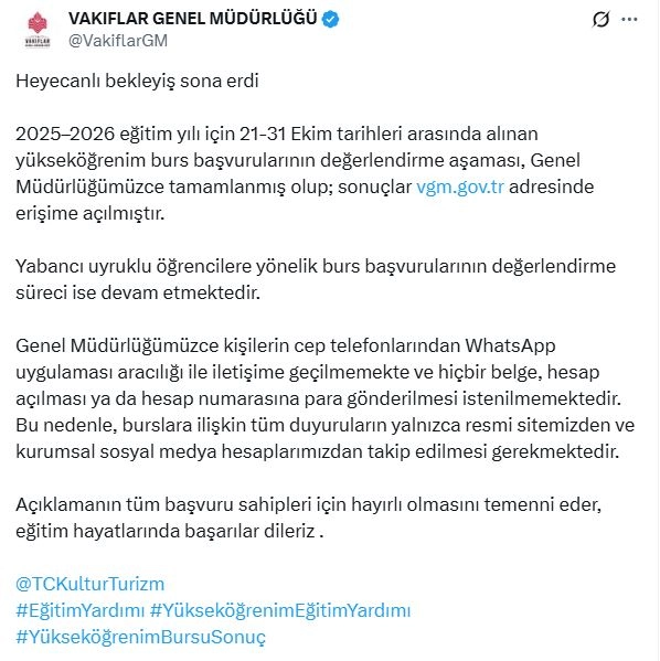 Vakıflar Genel Müdürlüğü'nün sosyal medya hesabından yapılan açıklamada, "Heyecanlı bekleyiş sona erdi. 2025-2026 eğitim yılı için 21-31 Ekim tarihleri arasında alınan yükseköğrenim burs başvurularının değerlendirme aşaması, Genel Müdürlüğümüzce tamamlanmış olup; sonuçlar http://vgm.gov.tr adresinde erişime açılmıştır. Yabancı uyruklu öğrencilere yönelik burs başvurularının değerlendirme süreci ise devam etmektedir. Genel Müdürlüğümüzce kişilerin cep telefonlarından WhatsApp uygulaması aracılığı ile iletişime geçilmemekte ve hiçbir belge, hesap açılması ya da hesap numarasına para gönderilmesi istenilmemektedir. Bu nedenle, burslara ilişkin tüm duyuruların yalnızca resmi sitemizden ve kurumsal sosyal medya hesaplarımızdan takip edilmesi gerekmektedir. Açıklamanın tüm başvuru sahipleri için hayırlı olmasını temenni eder, eğitim hayatlarında başarılar dileriz" denildi. (DHA)