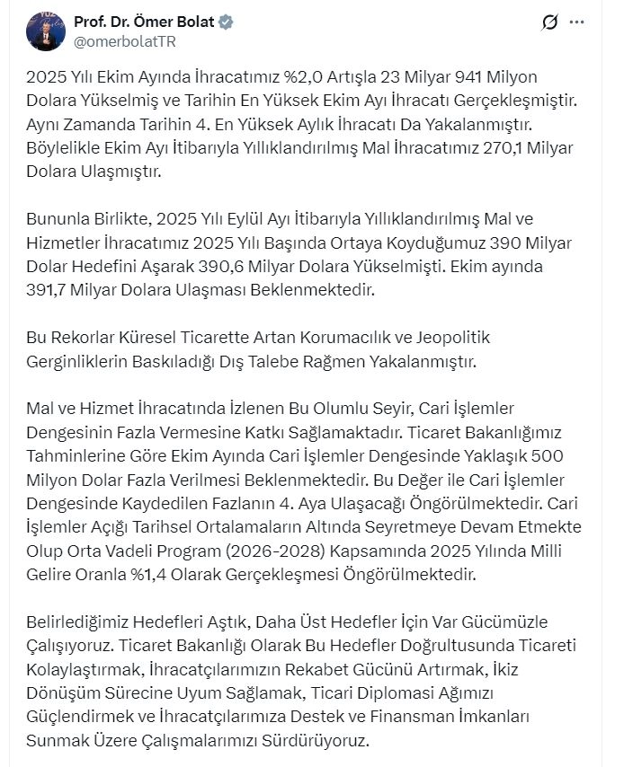 Bakan Bolat, Türkiye İstatistik Kurumu'nun açıkladığı ekim ayı dış ticaret istatistiklerini değerlendirdi. Bolat, sosyal medya hesabından yaptığı açıklamada, "2025 yılı ekim ayında ihracatımız yüzde 2 artışla 23 milyar 941 milyon dolara yükselmiş ve tarihin en yüksek ekim ayı ihracatı gerçekleşmiştir. Aynı zamanda tarihin 4'üncü en yüksek aylık ihracatı da yakalanmıştır. Böylelikle ekim ayı itibarıyla yıllıklandırılmış mal ihracatımız 270,1 milyar dolara ulaşmıştır. Bununla birlikte, 2025 yılı eylül ayı itibarıyla yıllıklandırılmış mal ve hizmetler ihracatımız 2025 yılı başında ortaya koyduğumuz 390 milyar dolar hedefini aşarak 390,6 milyar dolara yükselmişti. Ekim ayında 391,7 milyar dolara ulaşması beklenmektedir" dedi.