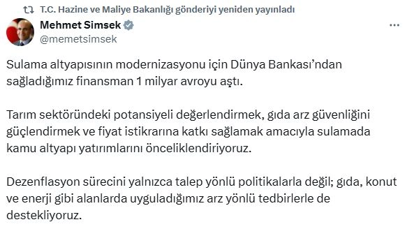 ANKARA, (DHA)- HAZİNE ve Maliye Bakanı Mehmet Şimşek, sulama altyapısının modernizasyonu için Dünya Bankası'ndan sağlanan finansman miktarının 1 milyar avroyu aştığını açıkladı.Hazine ve Maliye Bakanı Mehmet Şimşek, sosyal medya hesabından yaptığı açıklamada, "Sulama altyapısının modernizasyonu için Dünya Bankası'ndan sağladığımız finansman 1 milyar avroyu aştı. Tarım sektöründeki potansiyeli değerlendirmek, gıda arz güvenliğini güçlendirmek ve fiyat istikrarına katkı sağlamak amacıyla sulamada kamu altyapı yatırımlarını önceliklendiriyoruz. Dezenflasyon sürecini yalnızca talep yönlü politikalarla değil; gıda, konut ve enerji gibi alanlarda uyguladığımız arz yönlü tedbirlerle de destekliyoruz" ifadelerini kullandı. (DHA)