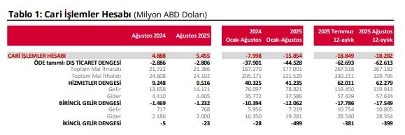 ANKARA, (DHA)- TÜRKİYE Cumhuriyet Merkez Bankası (TCMB), ağustos ayında cari işlemler hesabının 5 milyar 455 milyon dolar fazla verdiğini açıkladı. TCMB, Ağustos 2025 dönemine ilişkin ödemeler dengesi istatistiklerini açıkladı. Buna göre; ağustos ayında cari işlemler hesabı 5 milyar 455 milyon dolar fazla verdi. Altın ve enerji hariç cari işlemler hesabı da 10 milyar 5 milyon dolar fazla verdi. Ödemeler dengesi tanımlı dış ticaret açığı 2 milyar 806 milyon dolar olarak gerçekleşti. Yıllıklandırılmış verilere göre, ağustos ayında cari açık yaklaşık 18,3 milyar dolar olurken, ödemeler dengesi tanımlı dış ticaret dengesi de 62,6 milyar dolar açık verdi. Aynı dönemde hizmetler dengesi 62,3 milyar dolar fazla verirken, birincil ve ikincil gelir dengesi sırasıyla 17,5 milyar dolar ve 399 milyon dolar açık verdi. Hizmetler dengesi kaynaklı net girişler bu ay 9 milyar 516 milyon dolar seviyesinde gerçekleşti. Bu kalem altında taşımacılık hizmetleri ve seyahat kaleminden kaynaklanan net gelirler sırasıyla 2 milyar 769 milyon dolar ve 7 milyar 665 milyon dolar oldu.FİNANS HESABI2025 yılı Ağustos ayı yıllık cari açığın finansmanına, net doğrudan yatırımlar 6,5 milyar dolar, krediler 27,3 milyar dolar, ticari krediler 2,9 milyar dolar ve efektif ve mevduatlar 1,4 milyar dolar net katkı verirken; portföy yatırımları 0,4 milyar dolar negatif yönlü net bazda etki etti. Merkez Bankası döviz cinsinden rezerv artışı 1,2 milyar dolar oldu. Ağustos ayında doğrudan yatırımlar kaynaklı net girişler 986 milyon dolar olarak kaydedildi. Yurt dışı yerleşiklerin Türkiye'ye toplam doğrudan yatırımları 1 milyar 768 milyon doları artarken, yurt içi yerleşiklerin yurt dışındaki doğrudan yatırımları 782 milyon dolar arttı. Gayrimenkul yatırımları incelendiğinde, yurt içi yerleşiklerin yurt dışında 288 milyon dolar gayrimenkul alımı ve yurt dışı yerleşiklerin ise Türkiye'de 202 milyon dolar net gayrimenkul alımı yaptığı görüldü.Portföy yatırımları 662 milyon dolar tutarında net çıkış kaydetti. Yurt dışı yerleşiklerin hisse senedi piyasasında 279 milyon dolar ve DİBS piyasasında 1 milyar 572 milyon dolar net alış yaptığı görüldü. Yurt dışındaki tahvil ihraçlarıyla ilgili olarak; yurt dışı yerleşiklerin bankalar, genel hükümet ve diğer sektör ihraçlarında sırasıyla 337 milyon dolar, 940 milyon dolar ve 74 milyon dolar net satış yaptığı görüldü. Yurt dışından kredi kullanımlarında bu ay bankalar ve diğer sektörler sırasıyla 2 milyar 798 milyon dolar ve 1 milyar 239 milyon doları net kullanım gerçekleştirirken, genel hükümet 68 milyon dolar net geri ödeme gerçekleştirdi. Diğer yatırımlar altında, yurt dışı bankaların yurt içindeki mevduatları, Türk lirası cinsinden 1 milyar 8 milyon dolar azalırken, yabancı para cinsinden 640 milyon dolar net artış gösterdi ve toplamda 368 milyon dolar net azalış kaydetti. Resmi rezervlerde bu ay 5 milyar 747 milyon dolar net artış oldu. (DHA)