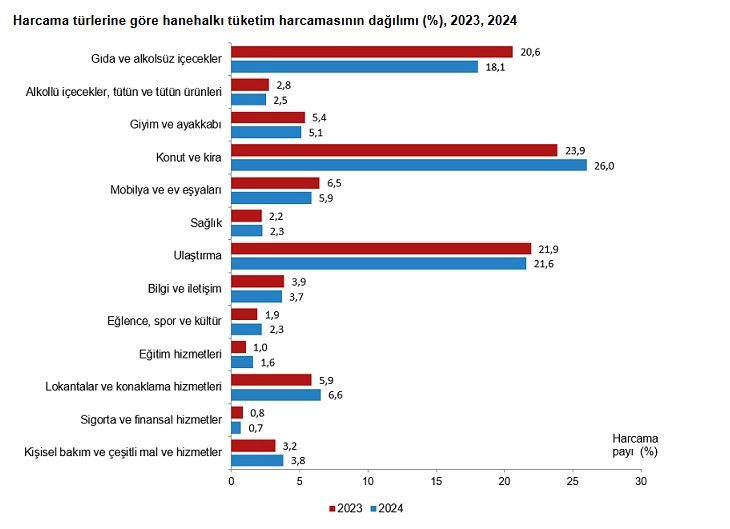Aybala MELEK/ANKARA, (DHA)- TÜRKİYE İstatistik Kurumu (TÜİK), 2024 yılında hanehalkı bütçesinden en fazla payın konut ve kira harcamalarına ayrıldığını açıkladı.TÜİK, 2024 yılına ilişkin hanehalkı tüketim harcaması istatistiklerini açıkladı. Buna göre; Türkiye genelinde hanehalklarının tüketim amaçlı yaptığı harcamalar içinde en yüksek payı yüzde 26 ile konut ve kira harcamaları alırken, ikinci sırayı yüzde 21,6 ile ulaştırma harcamaları, üçüncü sırayı ise yüzde 18,1 ile gıda ve alkolsüz içecekler harcamaları aldı. Toplam tüketim harcamalarında en düşük payı alan harcama türleri ise yüzde 0,7 ile sigorta ve finansal hizmetler, yüzde 1,6 ile eğitim hizmetleri ve yüzde 2,3 ile eğlence, spor ve kültür ile sağlık harcamaları oldu.DÜŞÜK GELİRLİ HANELER ULAŞIMA DAHA FAZLA PAY AYIRDITemel gelir kaynağı maaş, ücret, yevmiye geliri olan hanehalkları; konut ve kira harcamalarına yüzde 24, gıda ve alkolsüz içecekler harcamalarına yüzde 16,4 ve ulaştırma harcamalarına yüzde 23 pay ayırırken, müteşebbis geliri olan hanehalkları; konut ve kira harcamalarına yüzde 21,6, gıda ve alkolsüz içecekler harcamalarına yüzde 18,4 ve ulaştırma harcamalarına ise yüzde 26,4 pay ayırdı. Gelire göre sıralı yüzde 20'lik gruplar itibarıyla tüketim harcamalarının 2024 yılındaki dağılımına bakıldığında; en yüksek gelir grubu olan beşinci yüzde 20'lik grupta yer alan hanehalkları, ulaştırma harcamalarına yüzde 26,6, konut ve kira harcamalarına yüzde 22,1 ve gıda ve alkolsüz içecekler harcamalarına yüzde 12,8 pay ayırdı. En düşük gelir grubu olan birinci yüzde 20'lik grupta yer alan hanehalkları ise konut ve kira harcamalarına yüzde 33,2, gıda ve alkolsüz içecekler harcamalarına yüzde 30,4 ve ulaştırma harcamalarına yüzde 10,1 pay ayırdı.YALNIZ YAŞAYANLAR KİRAYA DAHA FAZLA PAY AYIRDIHanehalkı büyüklüğüne göre tüketim harcamalarının 2024 yılındaki dağılımına bakıldığında; tek kişilik hanehalkları, konut ve kira harcamalarına yüzde 35,2, gıda ve alkolsüz içecek harcamalarına yüzde 15,1 ve ulaştırma harcamalarına yüzde 14,4 pay ayırdı. Hanehalkı büyüklüğü 6 ve daha fazla kişi olan hanehalkları, gıda ve alkolsüz içecekler harcamalarına yüzde 24,7, konut ve kira harcamalarına yüzde 22,4 ve ulaştırma harcamalarına yüzde 20,4 pay ayırdı.Gelir düzeyi arttıkça gıda ürünlerini çöpe atarak israf etme sıklığının arttığı gözlendi. Hanehalkları tarafından en fazla israf edilen gıda grupları incelediğinde ise; en büyük payı yüzde 40,1 ile taze meyve ve sebze alırken, bunu yüzde 32 ile ekmek, yüzde 14,3 ile süt ve süt ürünleri izledi. (DHA)