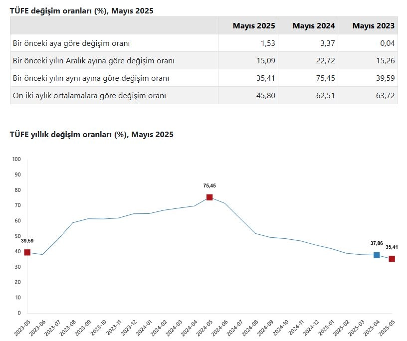 Caner ÜNVER/ANKARA, (DHA)- TÜRKİYE İstatistik Kurumu (TÜİK), mayıs ayına ilişkin enflasyon verilerini açıkladı. Tüketici enflasyonu yıllık yüzde 35,41, aylık yüzde 1,53 oldu.TÜİK, Mayıs 2025 dönemine ilişkin tüketici fiyat endeksi verilerini açıkladı. Buna göre; tüketici fiyatları, bir önceki aya göre yüzde 1,53, bir önceki yılın aralık ayına göre yüzde 15,09, bir önceki yılın aynı ayına göre yüzde 35,41 ve 12 aylık ortalamalara göre yüzde 45,80 arttı.En yüksek ağırlığa sahip 3 ana harcama grubunun yıllık değişimleri; gıda ve alkolsüz içeceklerde yüzde 32,87 artış, ulaştırmada yüzde 24,59 artış ve konutta yüzde 67,43 artış olarak gerçekleşti. İlgili ana grupların yıllık değişime olan etkileri ise gıda ve alkolsüz içeceklerde yüzde 8,25, ulaştırmada yüzde 4,07 ve konutta yüzde 9,34 oldu. En yüksek ağırlığa sahip 3 ana harcama grubunun aylık değişimleri; gıda ve alkolsüz içeceklerde yüzde 0,71 azalış, ulaştırmada yüzde yüzde 2,66 artış ve konutta yüzde 2,99 artış olarak gerçekleşti. İlgili ana grupların aylık değişime olan etkileri ise gıda ve alkolsüz içeceklerde yüzde eksi 0,18, ulaştırmada yüzde 0,40 ve konutta yüzde 0,48 oldu.Endekste kapsanan 143 temel başlıktan 28 temel başlığın endeksinde düşüş gerçekleşirken, 4 temel başlığın endeksinde değişim olmadı. 111 temel başlığın endeksinde ise artış gerçekleşti.Yurt içi üretici fiyatları da mayıs ayında bir önceki aya göre yüzde 2,48, bir önceki yılın aralık ayına göre yüzde 12,92, bir önceki yılın aynı ayına göre yüzde 23,13 ve 12 aylık ortalamalara göre yüzde 30,17 arttı. (DHA)